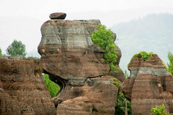紅石林 告別船工后一切便突然安靜下來,過山谷的小路沒有人家,偶爾傳來幾聲清脆的鳥叫。穿過幾座隘口,峰回路轉(zhuǎn)后“石林”漸漸露臉,石頭的顏色是由灰白到棕紅,變幻而又使人聯(lián)想。間或一棵參天大樹,或是綠竹三兩棵,則又是另一番景致了。于高于低、于肥于瘦的石林,于石于樹、于濃于淡的色彩,顯得雄奇又雋秀,并透露出一種清靈飄逸。 這些石柱不但顏色各異,而且大小不等。有的高達(dá)七、八米,而有些則像半埋于地下的巨獸骨架。一位村民告訴記者,現(xiàn)在石林沒有以前壯觀,都長渣子(灌木)了。原因是由于山頂樹木減少,雨水將泥土帶下山,很多石頭都被埋在土下,后來這些地方都開墾了農(nóng)田,石林也被永久覆蓋。 由于泥土覆蓋,石林被切割成一個(gè)個(gè)小區(qū)域,有些隱蔽在果林中,而有些則像突然從天而降,散落田間。