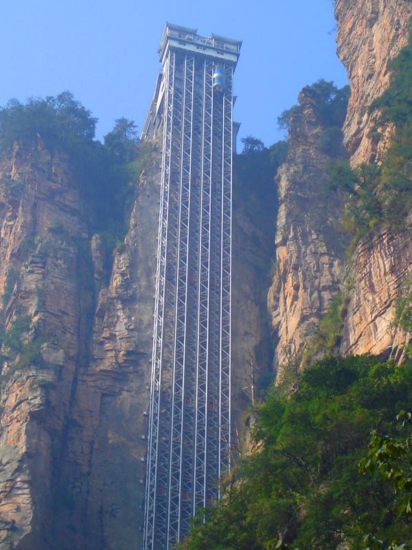 百龍?zhí)焯荩怪备卟?35米,運行高度326米,由154米山體內堅井和172米貼山鋼結構井架等組成,采用三臺雙層全暴露觀光電梯并列分體運行,每臺次載客50人次,運行速度3米/秒,三臺同時運行每小時往返量達4000人次。百龍?zhí)焯莸男藿▽崿F“山上游,山下住”的目標,提供了交通保障,將袁家界天下第一橋、迷魂臺、天懸白練以及烏龍寨、楊家界等絕世美景從幕后推向了前臺,并將天子山、袁家界、金鞭溪等精品旅游線路連為一體,解決了多年困擾景區(qū)的交通瓶頸問題。