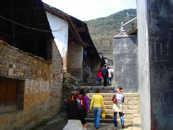 苦竹寨 賀龍?jiān)谏V哺锩鼤r(shí)期,幾乎踏遍了澧水兩岸的山山水水,村村寨寨?嘀裾清⑺叺囊蛔贁(shù)民族雜居的村落,保留了明清時(shí)的建筑特色,民風(fēng)淳樸,村民能歌善舞,許多桑植民歌都是靠苦竹寨的歌手流傳的。入夜的時(shí)候,苦竹寨亮起了盞盞紅燈,這是村里的一個(gè)傳統(tǒng)。當(dāng)年紅軍夜行軍過苦竹寨的時(shí)候,村里有個(gè)老婆婆怕紅軍夜黑路難走,便在家門口懸起了一盞紅燈,其它村民爭相效仿,苦竹寨成了一個(gè)燈的世界。這段軍民魚水情被寫成了歌,傳唱到現(xiàn)在,這就是《門前掛盞燈》。