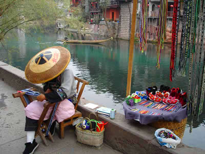 刺繡 刺繡。是土家姑娘在直紋平布上,按照布紋的經(jīng)緯和預(yù)先繪畫的花樣與底色不同的絲線繡成圖案。舊時姑娘們穿的繡花衣服,繡有服飾花邊、胸花、帽花,此外繡花枕頭、繡花荷包等也是精巧的手工工藝品。土家刺繡在配色上有自己的講究與習(xí)慣,一般選用青、藍、大紅等深色布料作底布,用淺色繡線制作圖案,或者相反,兩種用法的結(jié)果使繡品顯得質(zhì)樸逼真,色澤鮮艷,對比強烈。傳統(tǒng)圖案有“花開富貴”、“龍鳳呈祥”、“鴛鴦戲水”、“喜鵲鬧梅”、“松鶴同壽”等,分室內(nèi)、衣著、工具、行李裝飾等多種種類。在景區(qū),土家婦女邊繡邊賣的精美鞋墊,深受海內(nèi)外游客喜愛。